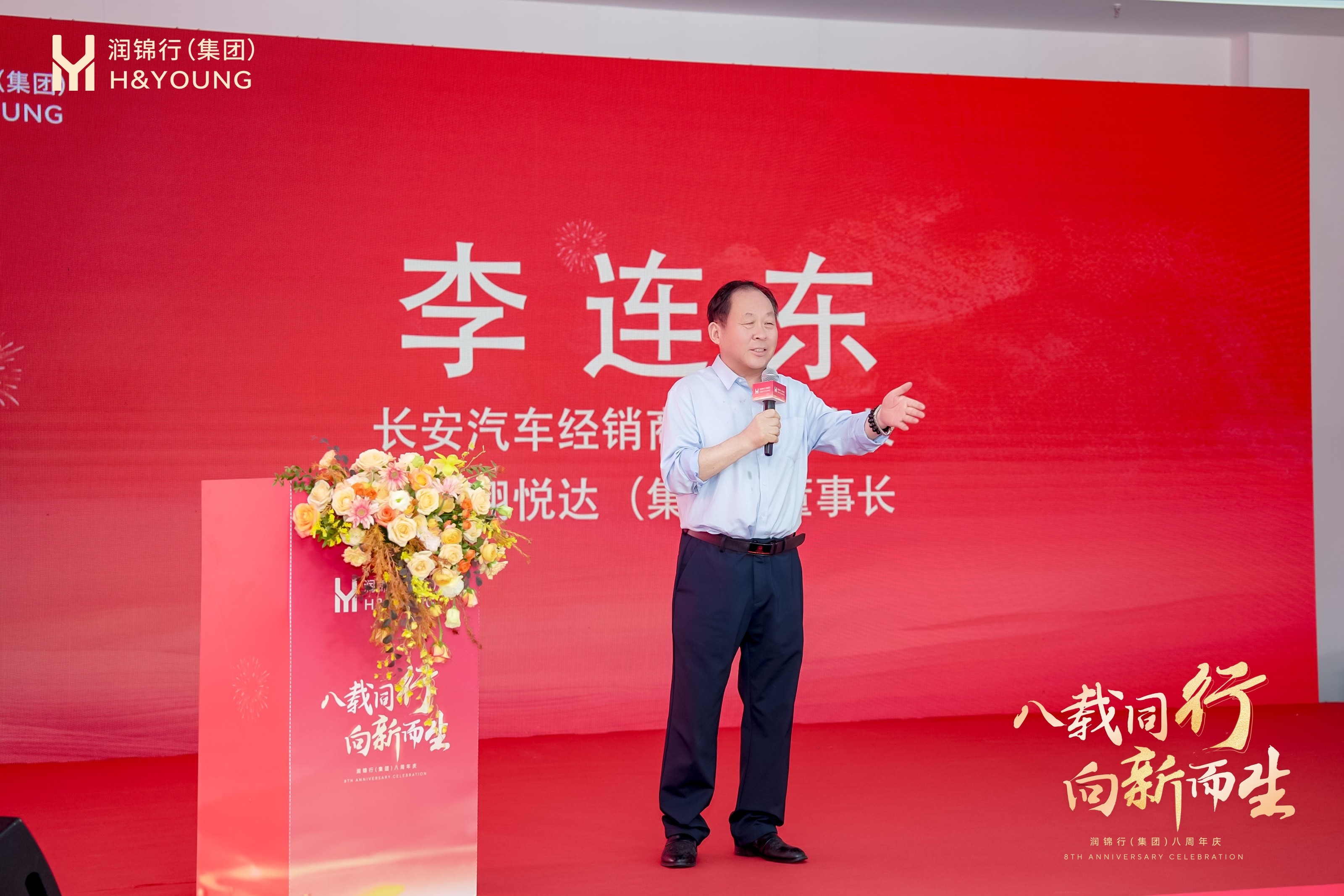 润锦行集团董事长刘厚学先生率先致辞,向陪伴集团成长的嘉宾表达敬意与感谢,阐述集团八年 “成长刻度”:2017 年依托长安汽车经销商管委会孵化器项目起步,历经渠道拓展、疫情与 “缺芯” 挑战下的逆势增长,2024 年跻身长安经销商集团全国 TOP3 并开启国际化布局,累计服务客户超 10 万名。他强调成绩离不开各方支持与团队奋斗,明确未来将深化 “全域协同”、推进 “全球化”、启动 “数字化引擎” 三大战略,依托新央企资源、携手新长安,以八周年为新起点,共赴新征程。